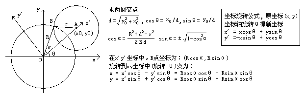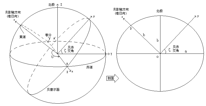 依上图建立椭圆方程 (x/a)2+(y/b)2=1,把x = -r*cosζ,y = r*sinζ代入得: 2、贝赤交线与贝黄交线的夹角 应用三垂线定理易证得自转轴总是在yz平面。由于太阳距我们很远,月球则要近得多,所以月球的移动对月影轴方向的影响是轻微的,月影轴的方向主要有太阳决定,基本与太阳相同,因此,如果太阳赤纬为负时,上图中y应画在北极左边。这就是说随着太阳运转,赤纬变化,北极在y轴上左右移动。 由于太阳黄纬小于2角秒且太阳视差小于10角秒,所以基面基本垂直于黄道面,当月影轴经过地球,基面与黄轴的夹角不超过10角秒。虽然,实际计算不推荐看成垂直,但建立这样一种概念有利于坐标变换。贝黄交角:约为90度。 下图则给出贝塞尔坐标、黄道、赤道、基面等的示意图: ![]() 图中∠BOA可按以下方法得到:由黄赤变换公式sinδ = sinβ cosε + cosβ sinε sinλ,A点赤纬是δ=0,B点黄经λ=υ,代入得tanβ = -tanε sinλ = -tanε sin(υ)。贝圆几乎垂直于黄道,所以A的黄纬β近似为∠BOA,则有tan∠BOA = -tanε sinυ 3、半影与贝圆的交点(求两圆交点,贝圆用地球平均半径) ![]() 4、半影与贝圆的交点(求两圆交点,贝圆看作椭圆) 方法与求角圆与圆的交点基本相同,但要多做一次重复计算。 5、半影与贝圆的交点(精确求法) 6、半影与贝圆的切点计算 ![]() 六、在贝塞尔坐标系中求解地球表面某点的速度: ![]() 求某一地标(含海拔)的贝塞尔坐标 求影轴上某点对应的本影和半影半径 影子中心相对于观测点的速度 求某时刻的中心点 地心到直线的距离 ![]() 距离改正 在贝塞尔坐标中,用两点法插值求地月距离(线性插值),会产生一定的误差,建议进行二次函数修正。如图,影足由O运动到A用时T日,角速度为ω ![]() R取地月平均值,以地球赤道半径为单位,即R=385000/6378=60.36,ω为日月黄经差的平均速度0.2128/日,则有f = 1.366(T2-t2),t是以中点O起算的。如果t从B点起算,B运动开A用时T,则f = 1.366t(T-t) 日出日没食甚线的绘图方法 计算的点数是有限的,所以画出的日出日没食甚线不会刚好经过南北界线的头尾端点,以下算法解决上问题。 ![]() 红线是半影直径,它垂直于影子的相对速度方向(影子相对交点上的观测者的速度,它与地球自转有关)。影子速度比贝塞尔平面上地球自转速度大许多,所以红线实际基本垂直于影速方向,倾斜不多。随着影子的移动,红线与贝圆的连续的交点构成日出没食甚线。 上图中的连接图:当北界不存在时,q1连续写点造成q3不存在,因此连线前构造一个q3,即在q3线头写入q1的最后一点;当北界存在时,q1线尾与q3线头分别补上北界的线头和线尾,产生的效果有两个,其一确保q1和q3不为空线,其二使线头连接到北界的端点。q2与q4处理的方法相同。 绘图方法:只要北界存在,不论q1和q3是否存在,q1线尾强制接北界头,q3线头强制接北界尾;如果不存在,q3必不存在,则强制补一个与q1连续的坐标生成一个q3。南界的处理方法类推。最后q1、q2线头连接,q3、q4线尾连接。 |